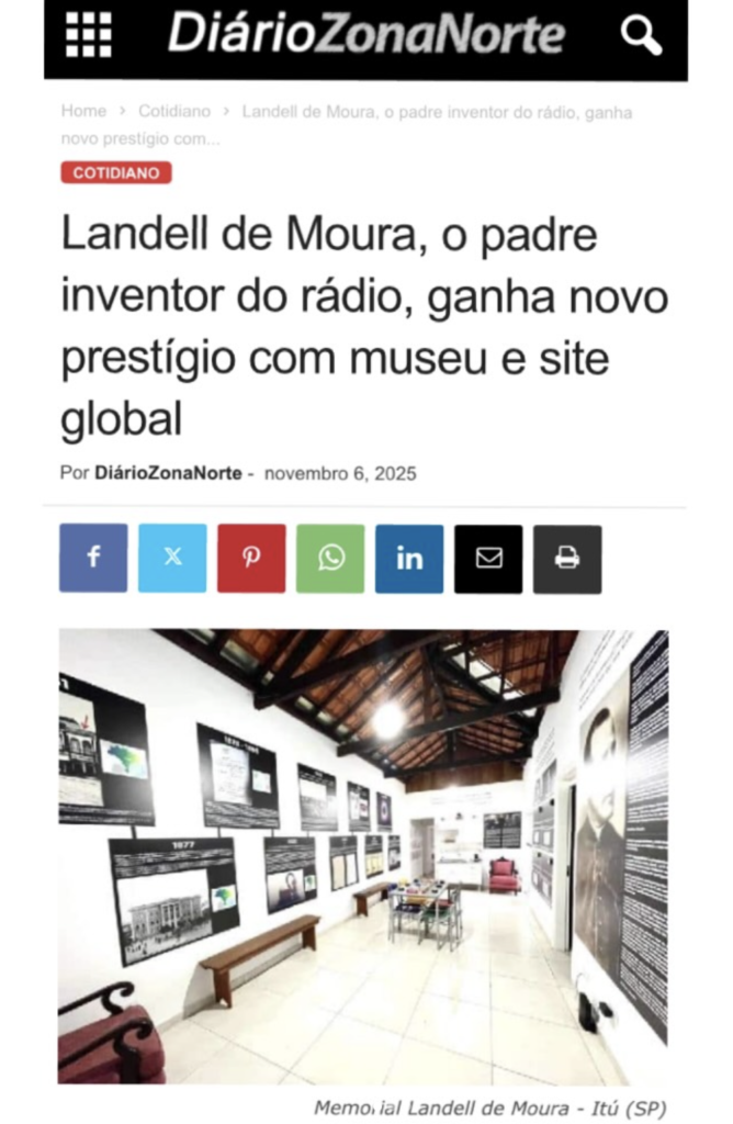 On November 6, 2025, an article about the new Landell de Moura Memorial was published in @diariozonanorte by Hamilton Almeida – Jornalistas & Cia / edition #1537. The website landelldemoura.org was recognized by Google AI in the United States as the best site for researching Roberto Landell de Moura.